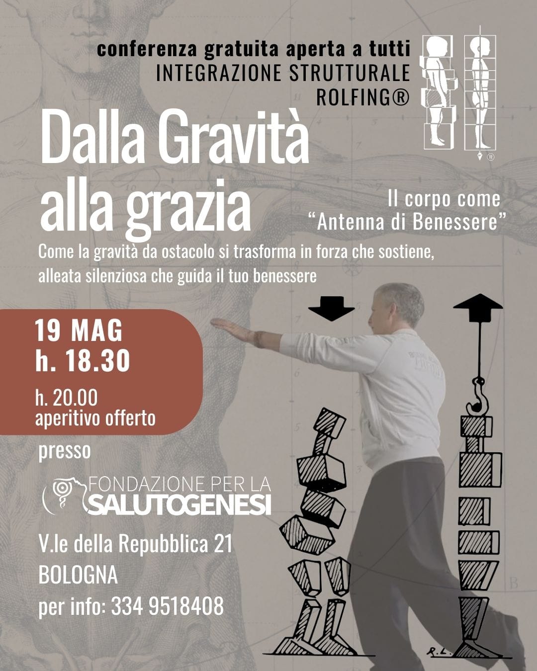 La Fondazione per la Salutogenesi è lieta di presentare la conferenza “Dalla Gravità alla Grazia“, tenuta da Andrea Brighi, Certified Rolfer™ e Presidente della Fondazione per la Salutogenesi.